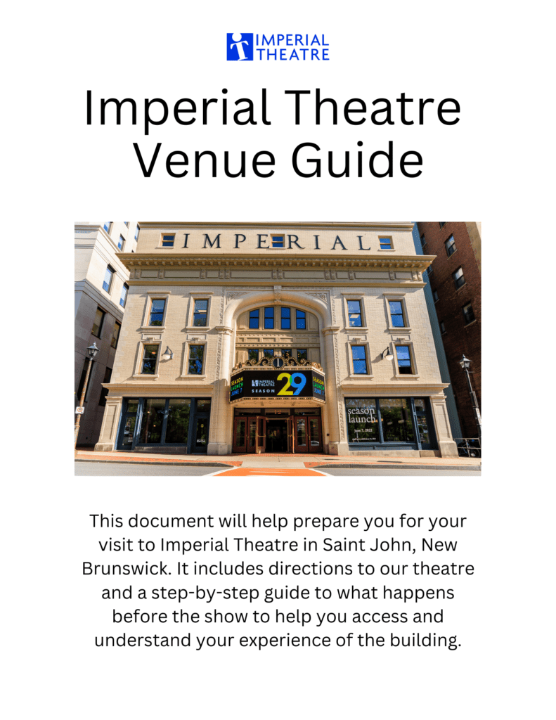 This document will help prepare you for your visit to Imperial Theatre in Saint John, New Brunswick. It includes directions to our theatre and a step-by-step guide to what happens before the show to help you access and understand your experience of the building.